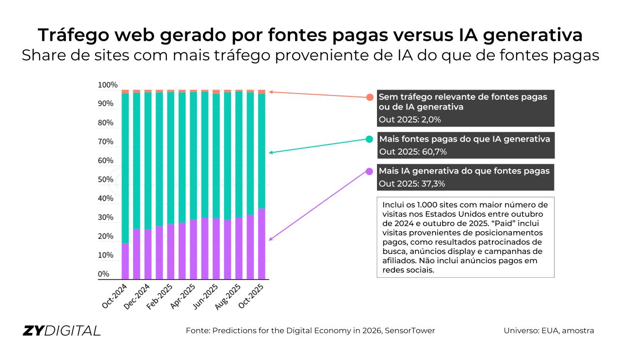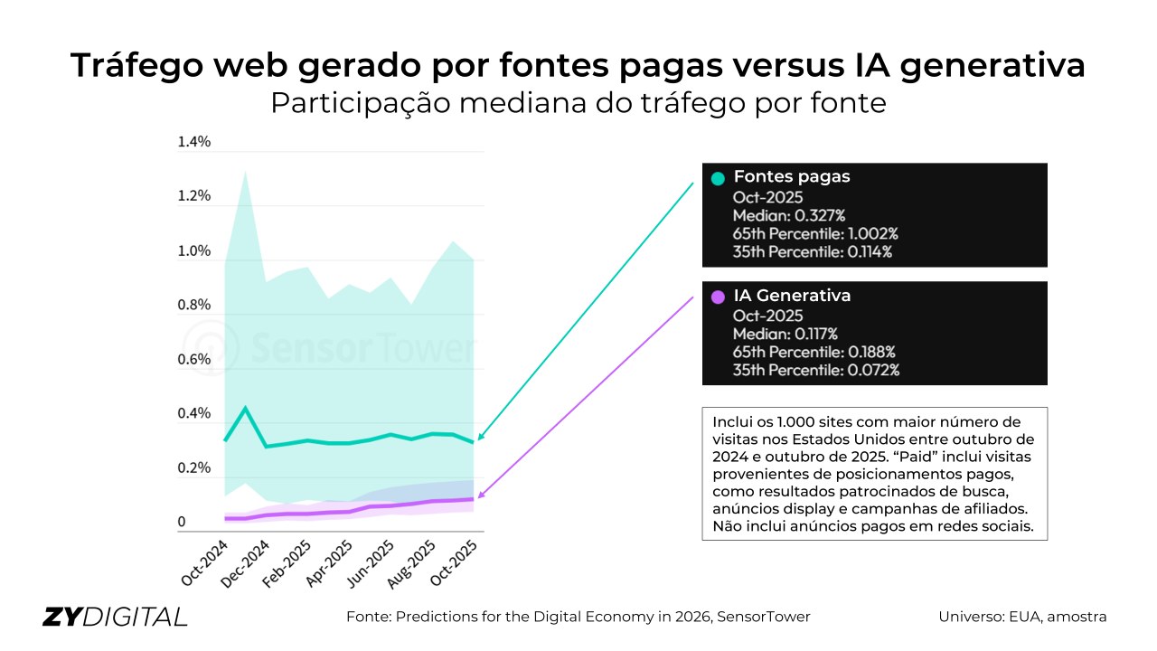 O levantamento indica que o tráfego pago é muito variável e concentrado em grandes anunciantes (grandes varejistas e sites de e-commerce), enquanto a IA generativa distribui visitas de modo mais homogêneo. Esse comportamento ampliou a base de sites beneficiados. Em outubro de 2025, mais de 37% dos principais sites norte-americanos já recebiam mais tráfego de IA generativa do que de anúncios patrocinados. A projeção da SensorTower aponta que, até o fim de 2026, mais da metade dos principais sites verá a IA ultrapassar as campanhas pagas como fonte de tráfego.